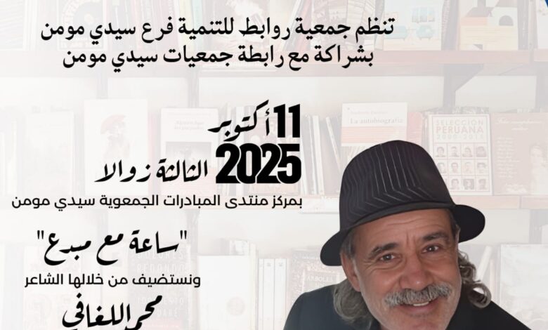 في إطار تفعيل البرنامج الثقافي لجمعية روابط للتنمية بفرعيها دار بوعزة وسيدي مومن، وانسجامًا مع أرضية مبادرة “ساعة مع مُبدِع” الهادفة إلى التعريف بالمبدعين المغاربة والتواصل المباشر معهم في مختلف مجالات الإبداع تحت شعار “الإبداع تنمية وإشعاع”، تُعلن الجمعية عن تنظيم اللقاء الثاني من المبادرة احتفاءً بالشاعر والفاعل الثقافي محمد الغافي، رئيس رابطة المبدعين المغاربة.