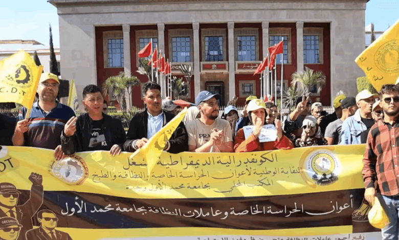 في بيان صادر عن المكتب الوطني للنقابة الوطنية لأعوان الحراسة الخاصة والنظافة والطبخ (كدش)، تم الانطلاق من سابقة خطيرة تمس الحق في الانتماء النقابي وممارسة الحريات النقابية المكفولة دستورياً، وتضرب عرض الحائط المواثيق الدولية التي صادق عليها المغرب. ويتعلق الأمر، بحسب البيان الذي توصلت “تنوير” بنسخة منه، بما أقدمت عليه شركة الحراسة الخاصة DESERT MAROCAIN المكلفة بتدبير خدمات الحراسة بالمؤسسات التعليمية بإقليم بولمان على تعليق أجور عدد من أعوان الحراسة الخاصة المنتمين إلى المكتب الإقليمي للنقابة الوطنية لأعوان الحراسة الخاصة والنظافة والطبخ، وذلك فقط لمشاركتهم في الوقفة الاحتجاجية الوطنية ليوم 20 أكتوبر أمام البرلمان دفاعاً عن كرامتهم وحقوقهم المشروعة.