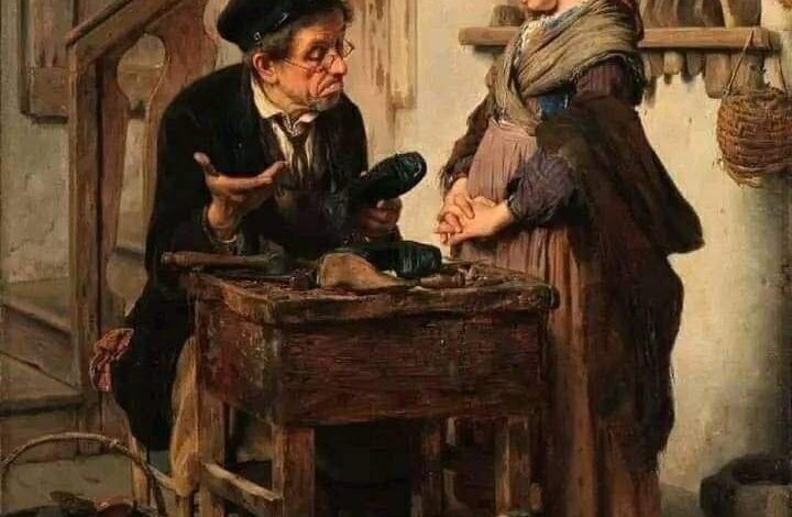 في هذه اللوحة التي رسمها أنطونيو روتا لا يحدث شيء كبير في الظاهر. طفلة تقف أمام إسكافي، وحذاء قديم موضوع على الطاولة، ورجل يحاول أن يقدّر إن كان بالإمكان إصلاحه. لكن في هذا المشهد البسيط تختبئ دراما إنسانية كاملة.