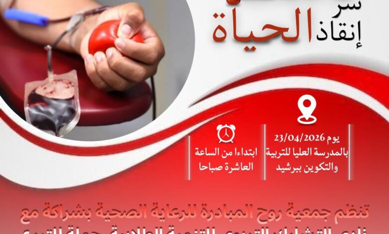 في إطار تعزيز قيم التضامن والعمل الإنساني داخل الوسط الطلابي، تنظم جمعية روح المبادرة للرعاية الصحية، بشراكة مع نادي التشارك التربوي للتنمية الطلابية، حملة للتبرع بالدم لفائدة طلبة المدرسة العليا للتربية والتكوين ببرشيد، وذلك يوم 23 أبريل 2026.